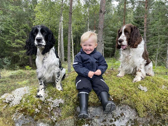 Idag på denna sten med två champions, och en pajaskille :). Underbart att få skutta runt i skogen och njuta efter en morgon med viltspår som slutade i ett championat!!
