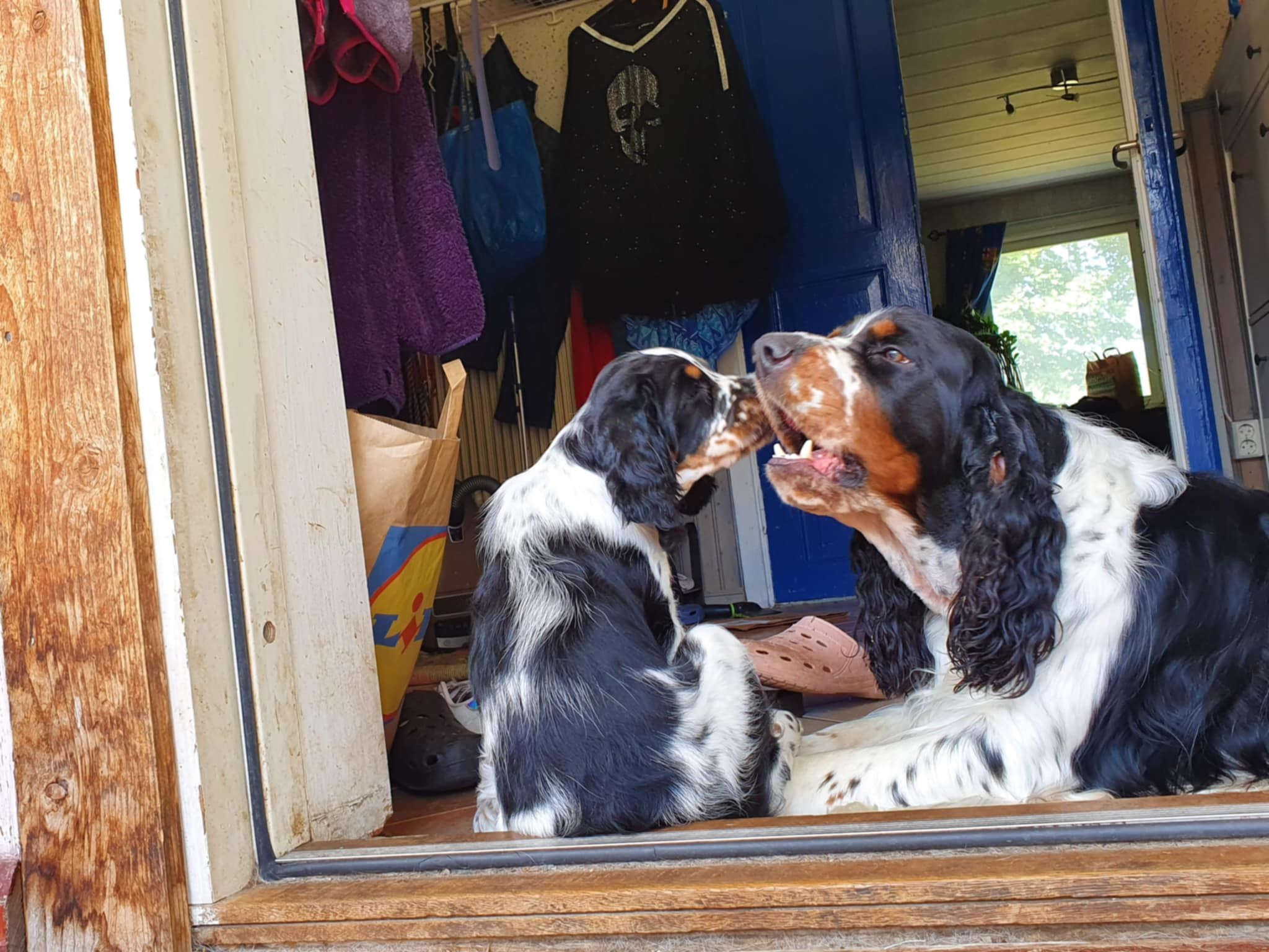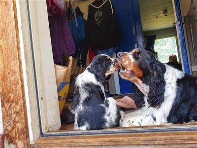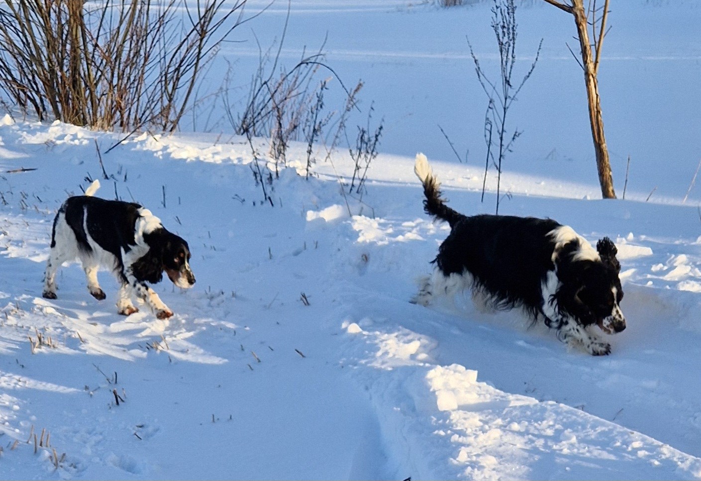 Båda är socialt trevliga hundar, mysiga och lugna med en himla fart ute.